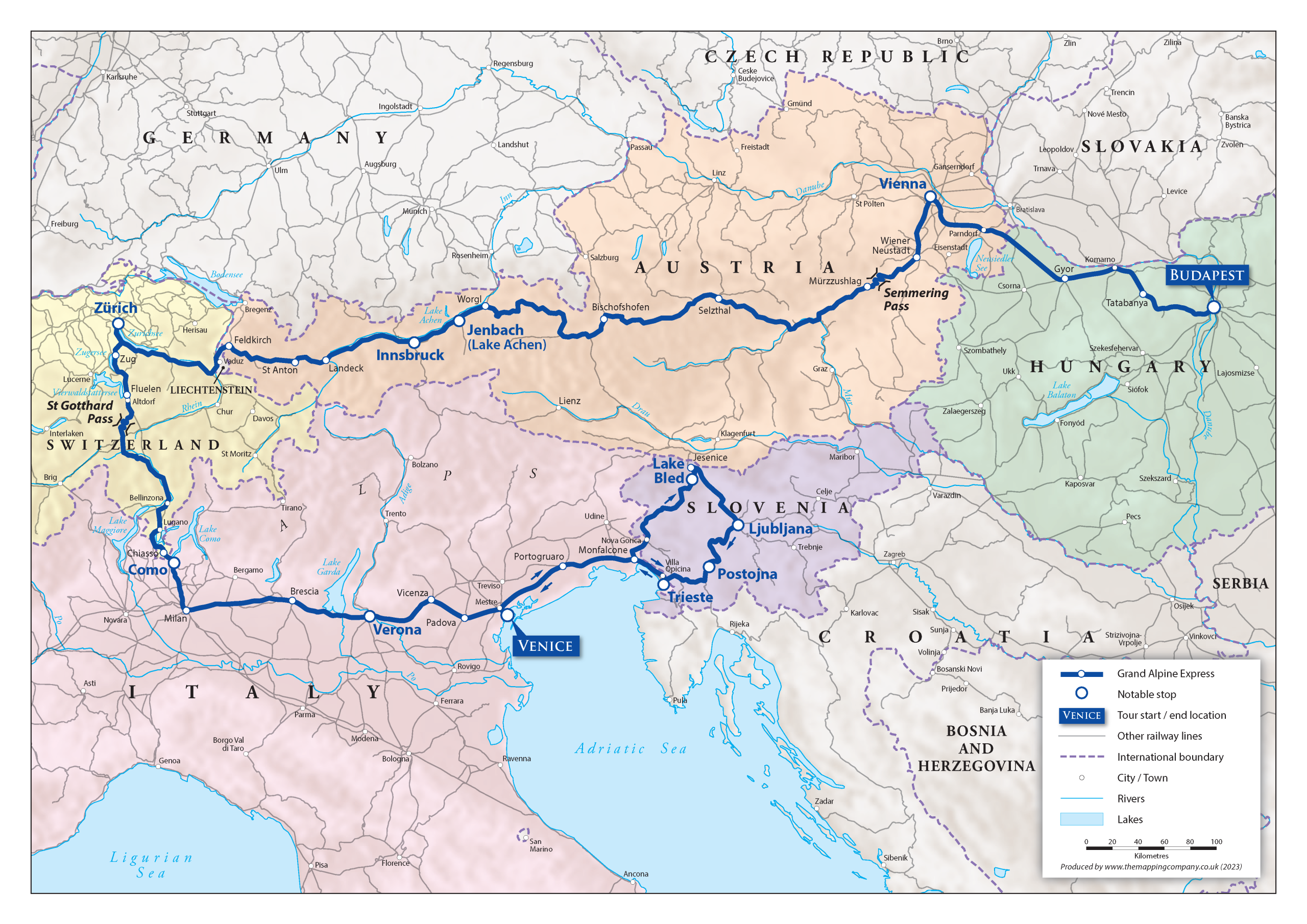 Budapest, Viena, Paso Semmering, Lago Achen, Innsbruck, Zurich, Paso de San Gotardo, Lago Como, Verona, Trieste, Lago Bled, Ljubljana, Postojna, Venecia